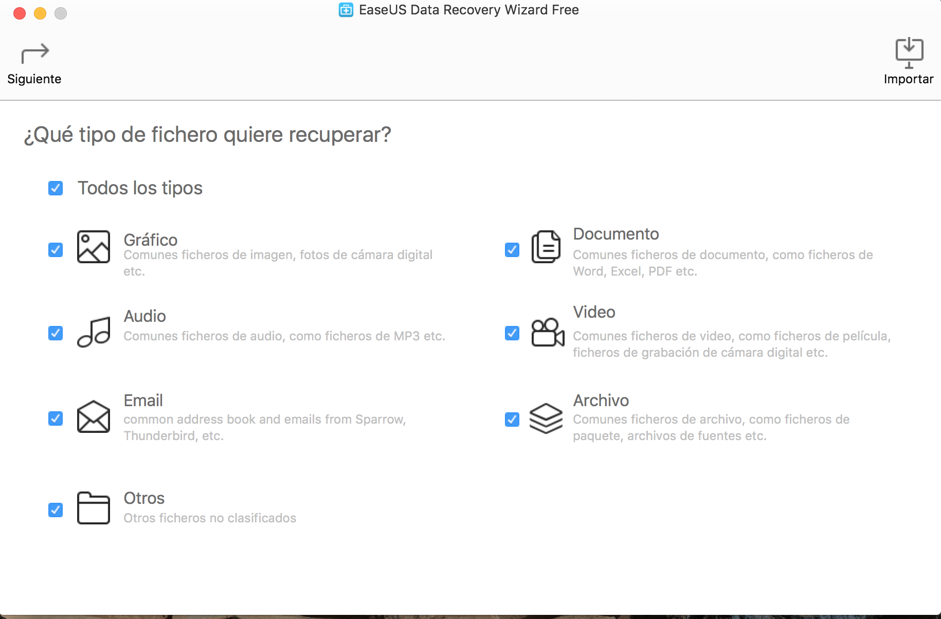 Luego de instalarlo y ejecutarlo este programa te pregunta que tipo de archivos estás buscando. Yo dejé todo tildado, para que busque todos los tipos de archivos. t